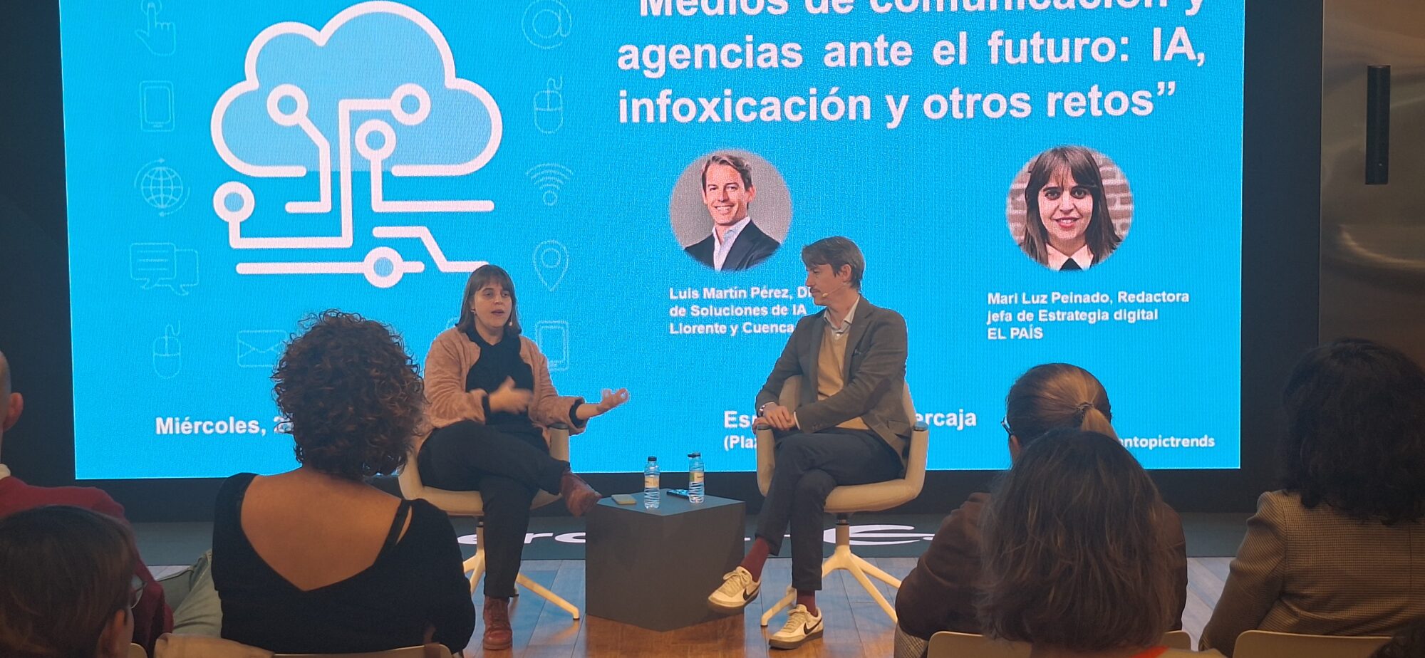 El evento, celebrado en el Espacio Xplora de Ibercaja, situado en la plaza Paraíso de Zaragoza, llevaba por título “Medios de comunicación y agencias ante el futuro: IA, infoxicación y otros retos” y contó con la participación de Mari Luz Peinado, Redactora Jefa de Estrategia Digital de revistas y verticales de El País, y Luis Martín Pérez, Director de Soluciones de IA de la Agencia Llorente y Cuenca, que conversaron durante más de hora y media sobre las ventajas y riesgos de la IA para los periodistas, ante un auditorio que sobrepasó las previsiones iniciales de participación. Hubo incluso una amplia representación de alumnos de 4º de Periodismo de la Universidad de Zaragoza. La IA supone un riesgo real para los periodistas, se advirtió, porque «la gente puede elegir la IA antes que a los medios para informarse«. Para hacer frente a este peligro, en este momento de descrédito social que atraviesa el periodismo, se reivindicó el periodismo serio, riguroso y contrastado realizado por periodistas.